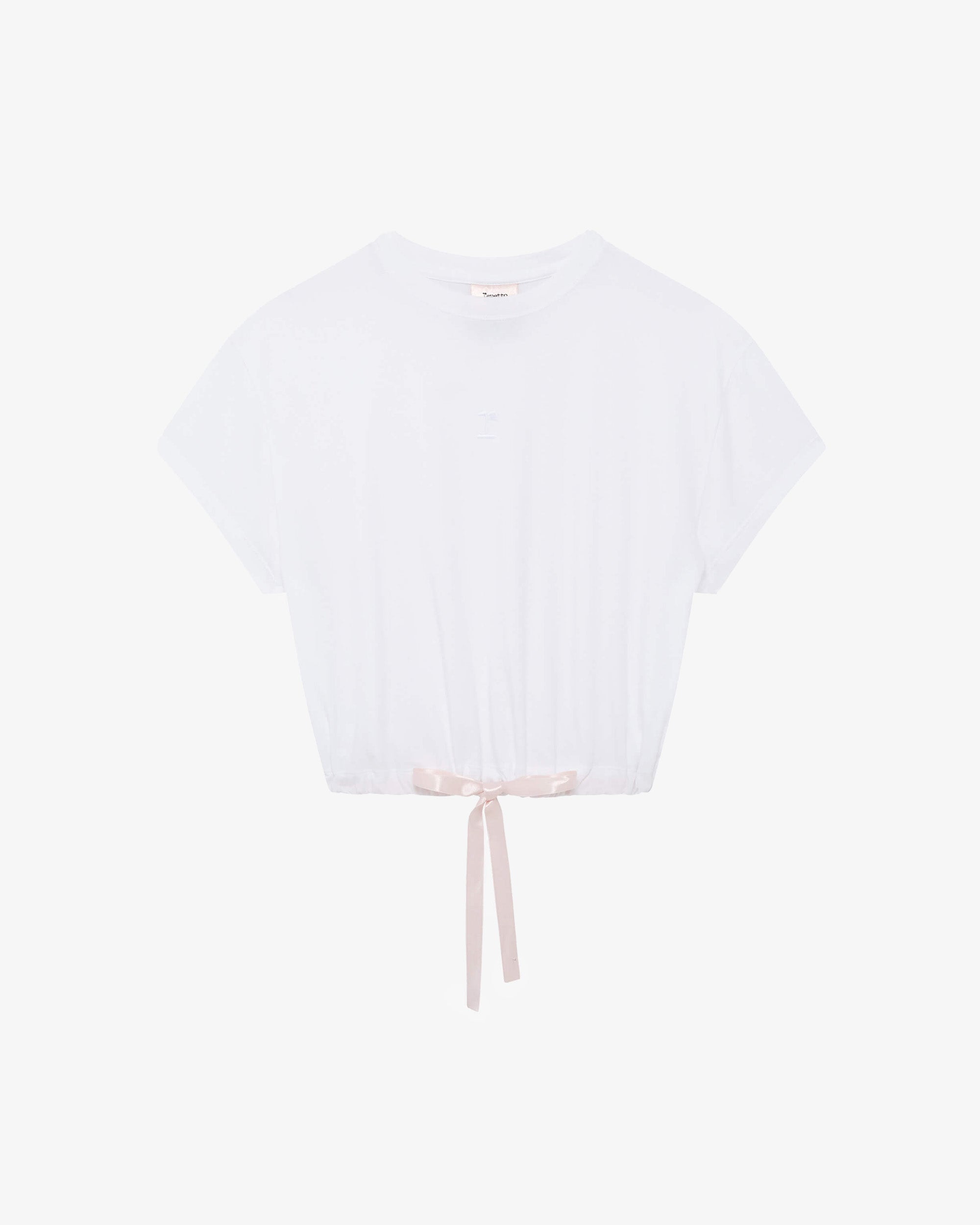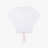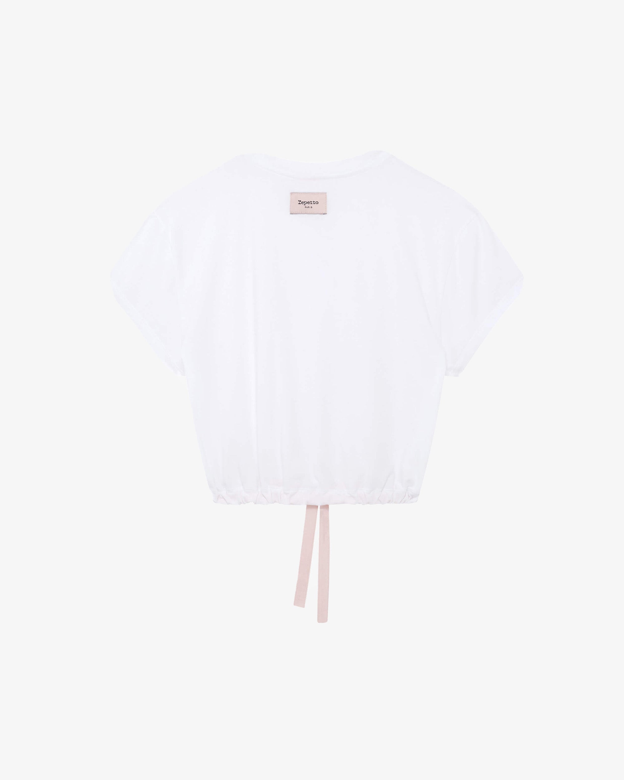 Détails : Ce T-shirt court à col rond capture l'essence du style féminin de Repetto avec une touche moderne : un ruban en satin coulissant à la taille et le logo R brodé à l'avant en font un élément indispensable de la collection Activewear Repetto. - Col rond - Manches courtes - Ruban en satin à la taille pour ajuster le modèle