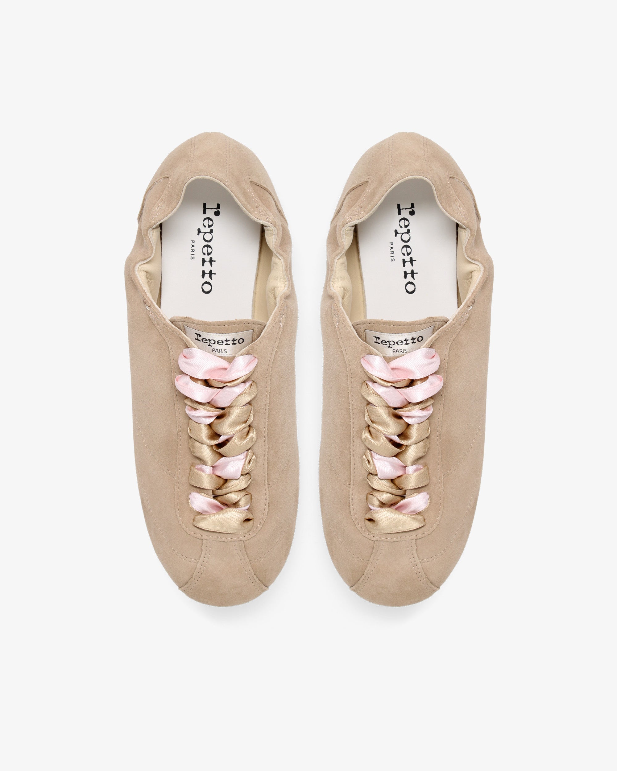 Nouvelle interprétation de l’univers Repetto, la Tennis Silk se situe à la croisée de la basket citadine et du ballet. Ses doubles lacets en satin, son col subtilement froncé et sa semelle fine reprennent les codes des ballerines tout en offrant un confort exceptionnel. Inspirée par la danse, cette création incarne grâce, féminité et modernité.