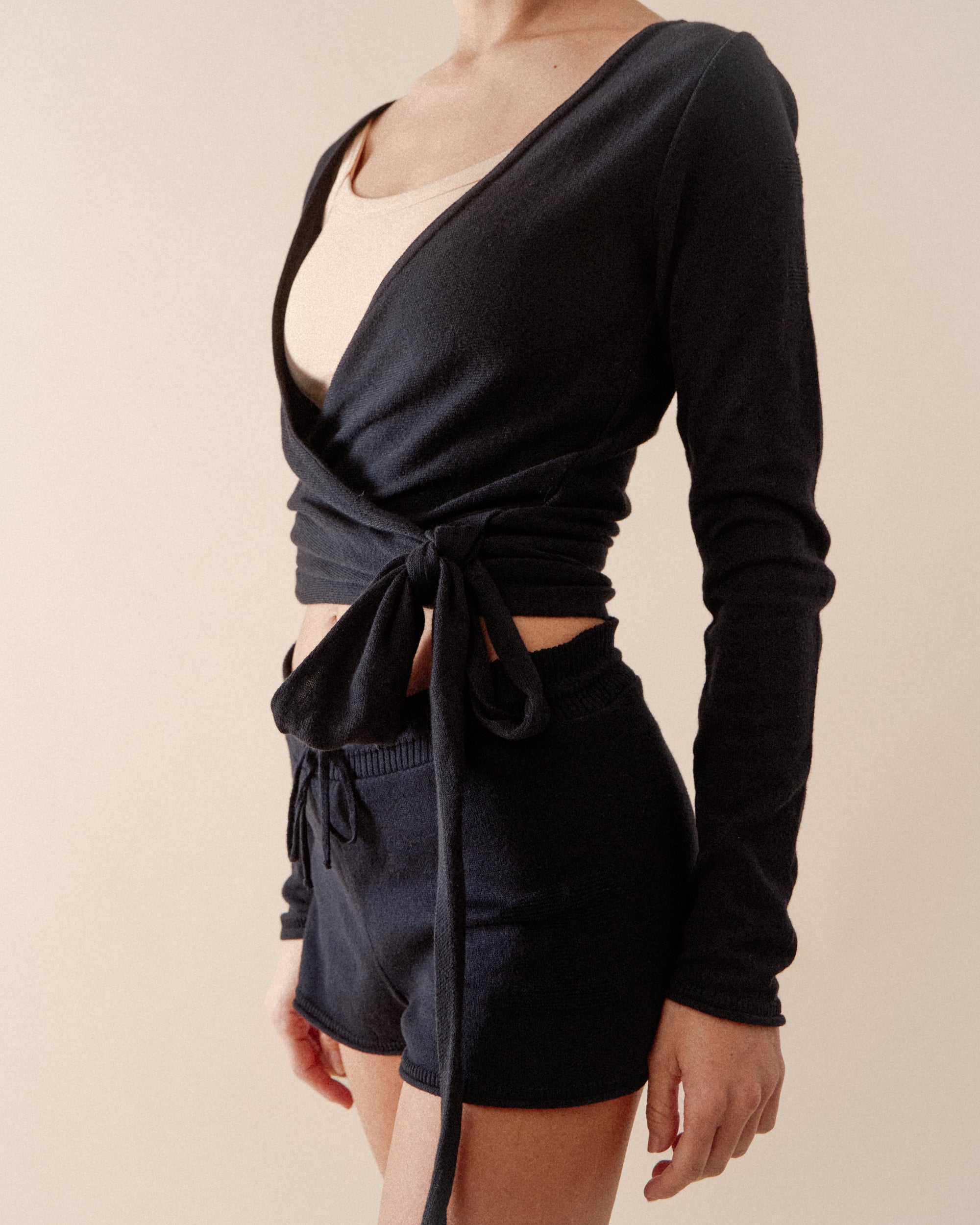 This wrap cardigan in a fancy knit is a dance class essential. Its V-neck and tie at the waist accentuate the dancer's posture and silhouette. The loose, fine knit provides comfort and fluidity while maintaining the classic warm-up knit. The tone-on-tone jacquard "R" subtly and elegantly displays the brand name.