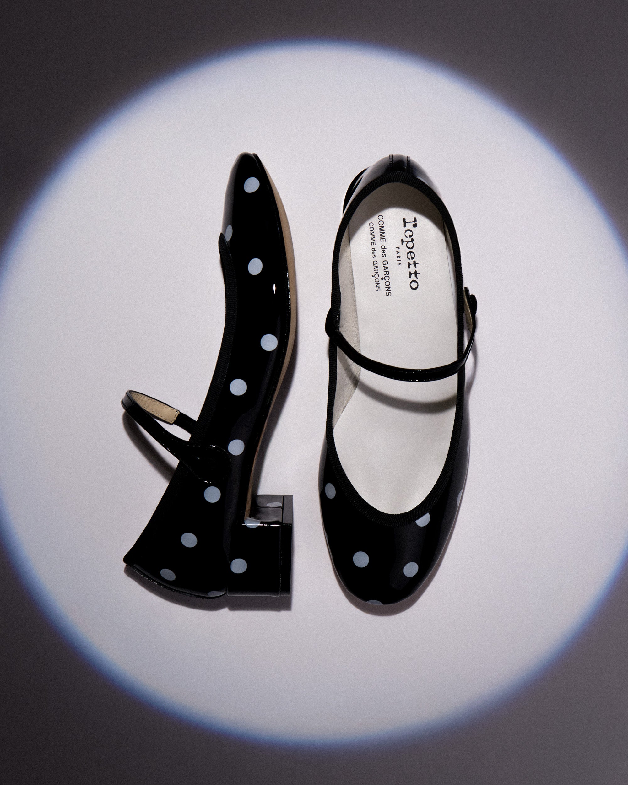 Made in France in the Repetto workshops using the iconic stitch-and-return technique — a signature of the Maison’s savoir-faire since 1947 — this model stands out with its graphic polka-dot finish, applied after the shoe’s construction through a hydrodipping process. Each pair thus becomes a singular and unique work of art, where Repetto’s timeless elegance meets the visual experimentation of Comme des Garçons.