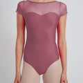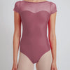 Ce justaucorps bi-matière pour femmes à manches courtes en résille présente une coupe original, associant un décolleté arrondi en résille et une forme en bustier opaque. Le dos en V est sublimé par un détail raffiné mêlant différentes matières.