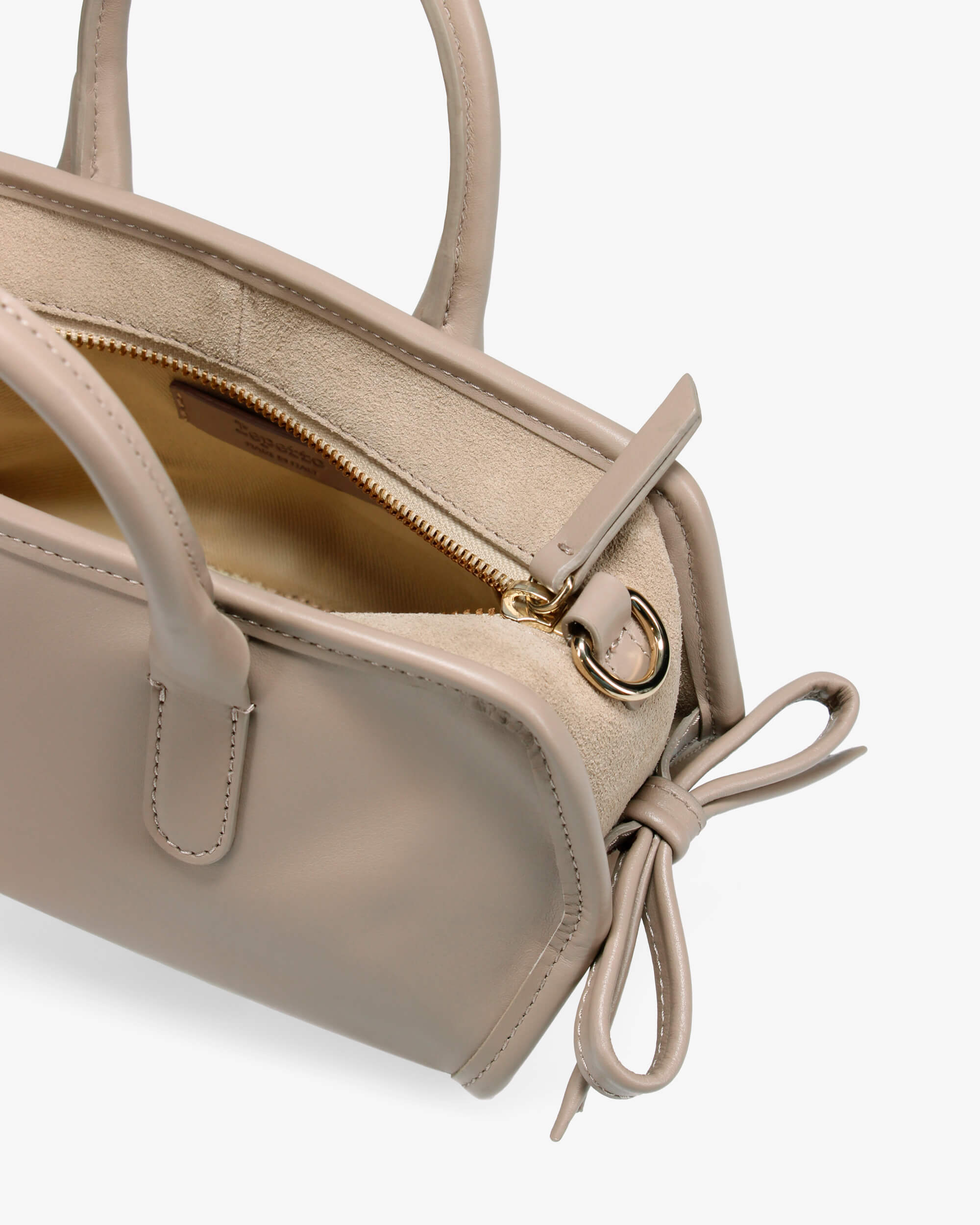 Inspiré des codes iconiques de la Maison, le sac Petit Gala est à la fois moderne et intemporel. Son petit format allongé pratique est sublimé par un jeu de matières sophistiqué alliant veau velours et cuir lisse. Ses nœuds délicats et sa signature embossée discrète expriment la fluidité et le raffinement chers à Repetto. Pensé pour accompagner le quotidien avec élégance et praticité, il se dote d'une délicate fermeture à zip signée. Fabriqué en Italie, il incarne l’héritage et l’excellence de la Maison.